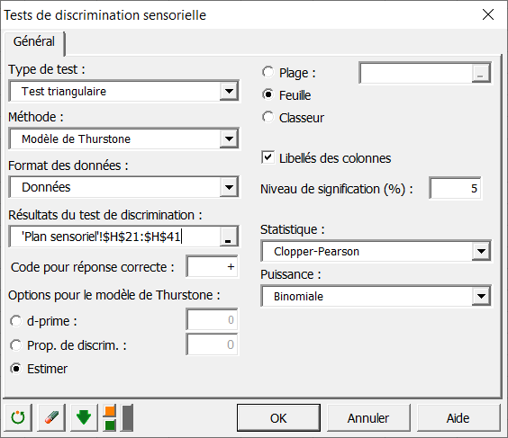 Une fois le bouton cliqué, la boîte de dialogue apparaît. Vous pouvez alors sélectionner le test du triangle et le modèle de Thurstone. Le modèle de Thurstone suppose que le profil sensoriel de chaque bière suit une loi normale, on va tester l'hypothèse selon laquelle ces lois sont similaires en utilisant un indice appelé d-prime (delta de Thurstone). Nous utilisons par ailleurs les données sélectionnées comme entrée en sélectionnant les résultats du test dans la dernière colonne du plan d'expérience.
