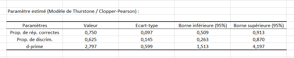 Le tableau suivant donne une estimation des paramètres en utilisant le modèle de Thurstone. On voit que tous ces paramètres sont élevés et que le d-prime est proche de 3 ce qui montre une très forte différence entre les profils sensoriels des deux bières.