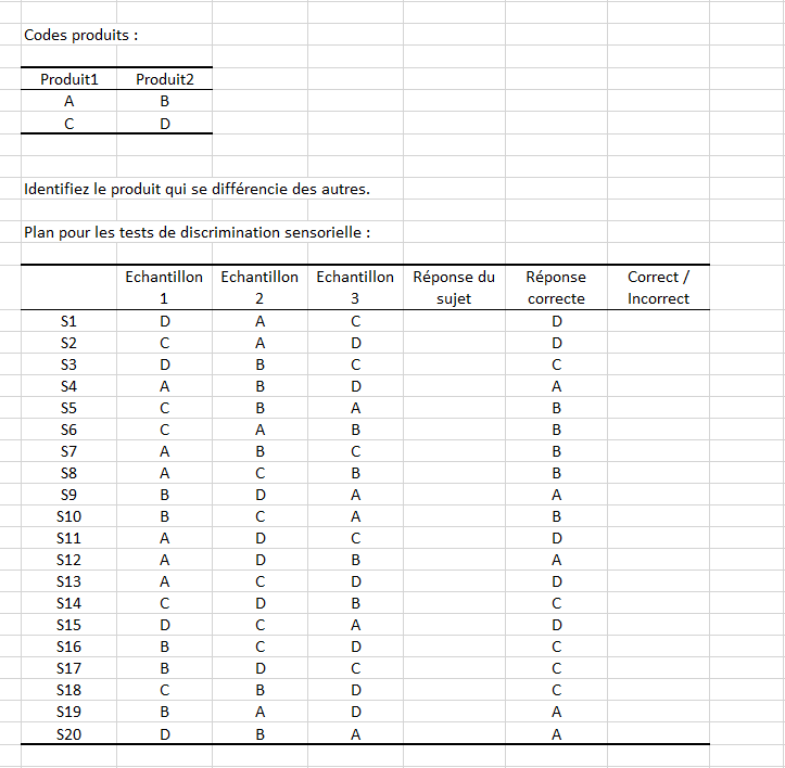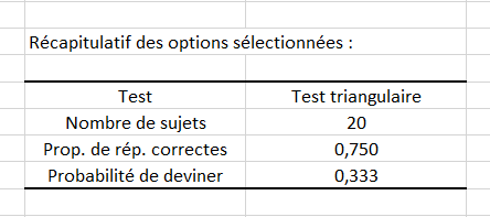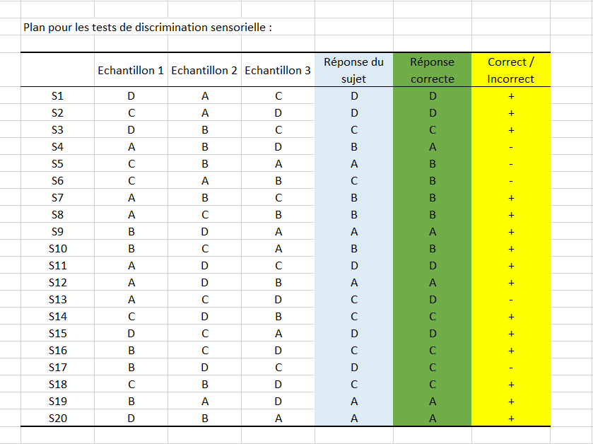 Le tableau obtenu vous permet de préparer votre test triangulaire avec vos 20 sujets. Chaque sujet va goûter 3 échantillons de bières dans l'ordre défini par le plan. Il devra reconnaître la bière présente une seule fois. La quatrième colonne permet de rentrer la réponse du sujet. La cinquième donne la réponse correcte. La dernière colonne permet d'entrer le résultat du test. Il suffit d'entrer un code pour une réponse correcte (+ dans notre cas) et un autre code pour une réponse incorrecte (- dans notre cas). On peut bien sûr utiliser d'autres codes.