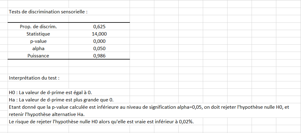 Puis, les résultats du test ainsi qu'une rapide interprétation sont donnés. Dans notre cas, on voit clairement que la p-valeur est <0,05 et on peut donc rejeter l'hypothèse nulle disant que d-prime est égal à 0. On peut donc dire que les profils sensoriels des deux bières sont différents. De plus, la puissance du test est très forte ce qui nous conforte dans nos conclusions.