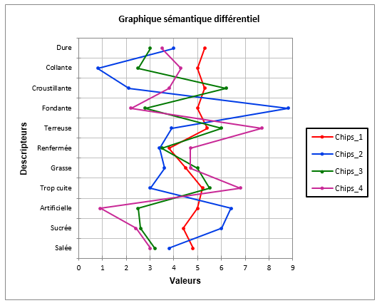 Les graphiques sémantiques différentiels peuvent aussi être utilisés pour comparer les profils sensoriels des produits.