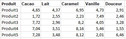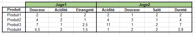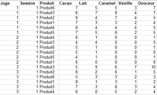 Vous trouverez ci-dessous un jeu de données typique d'une expérience de profil sensoriel.