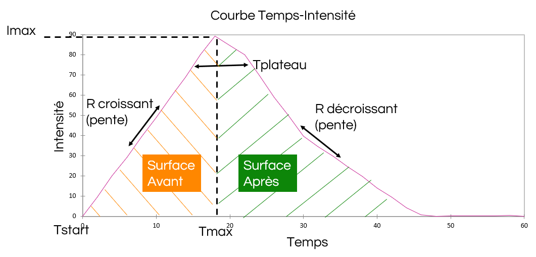 L’analyse Temps-Intensité compare des produits pour un attribut unique au cours du temps. Les données d'entrée doivent être quantitatives. Chaque évaluation est supposée suivre une courbe en forme de cloche : l'intensité de l’attribut augmente puis diminue avec le temps. Plusieurs paramètres (liste ici) de la courbe sont mesurés par le logiciel à chaque évaluation, et l'Analyse de Variance (ANOVA) est utilisée pour comparer ces paramètres entre les produits.