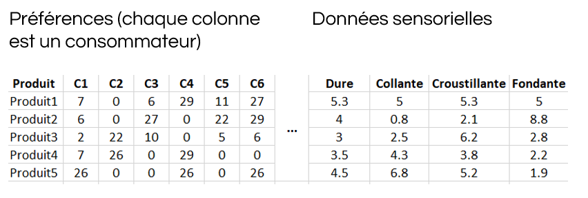 La Cartographie Externe des Préférences est une technique multivariée qui permet de modéliser les préférences en fonction des données sensorielles (exemple de données ci-dessous). Habituellement, l'espace sensoriel des produits est représenté sur une carte d’ACP, sur laquelle des zones de préférences plus ou moins élevées se superposent. La Cartographie Externe des Préférences permet notamment d'orienter le développement sensoriel d'un produit en direction des zones de préférences élevées.