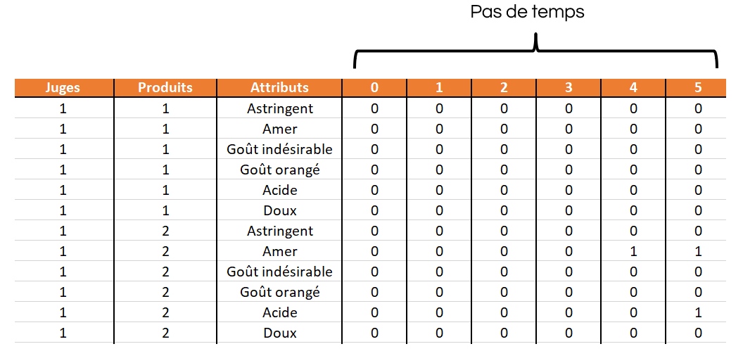 La Dominance Temporelle des Sensations (DTS) et TCATA sont deux fonctionnalités similaires car elles permettent de comparer les profils sensoriels de différents produits au cours du temps. Pour chaque produit et à chaque pas de temps, les juges sont invités à noter la présence ou l’absence de différents attributs (exemple de tableau de données ci-dessous). Alors que DTS est plus visuelle et descriptive, TCATA implique des tests de significativité des différences entre les produits pour chaque attribut à chaque pas de temps. De plus, TCATA fournit une carte des trajectoires des produits dans l'espace sensoriel.