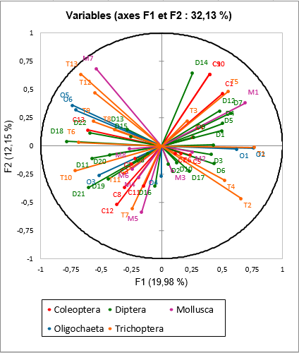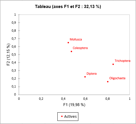 Si l’on regarde plus précisément les résultats et notamment les coordonnées des variables de l’AFC du tableau Trichoptera (ligne 517 de la feuille de résultats), on s’aperçoit que des valeurs négatives sur le premier axe de cette AFC correspondent à des fréquences importantes des espèces T1, T2, T3, T4 et T5.