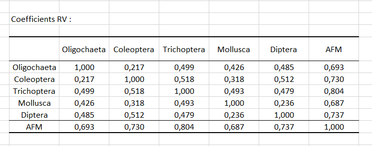 Les coefficients Lg de liaison entre les tableaux permettent de mesurer à quel point les tableaux sont liés deux à deux. Les coefficients RV (voir ci-dessous) de liaison entre les tableaux sont une autre mesure dérivée des coefficients Lg. La valeur des coefficients de RV est comprise entre 0 et 1, ce qui en facilite l'interprétation. Nous pouvons voir ici que les deux tableaux les plus liés sont les tableaux Diptera et Coleoptera.