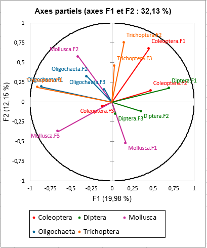 Le résultat suivant spécifique à l’AFM correspond à l’analyse des axes partiels. Le graphique des axes partiels permet de voir quels facteurs de chaque analyse séparée de chacun des tableaux sont corrélés avec les axes produits par l'AFM. On voit par exemple que l’axe 1 de l’AFC du tableau Oligochaeta et l’axe 1 de l’AFC du tableau Trichoptera sont fortement corrélés négativement avec l’axe 1 de l’AFM.