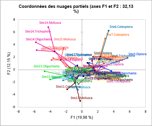 Le dernier graphique spécifique à l’AFM est le graphique des nuages partiels. Ce dernier représente les observations pour lesquelles on ajoute les observations partielles, c’est-à-dire les observations vues selon les différents tableaux. Les nuages partiels correspondent aux observations pour lesquelles seulement l'information fournie par un tableau est prise en compte, les valeurs pour les autres tableaux étant mises à 0. Ces observations sont ensuite projetées sur les axes comme des observations supplémentaires. Cela permet de visualiser comment les différents tableaux influencent la position d'un point donné. Par exemple, pour le site 14 on voit que le tableau Mollusca tend à rendre ce site encore plus différent des autres, ceci est aussi vrai pour le site 11 et le tableau Mollusca en bas du graphique.