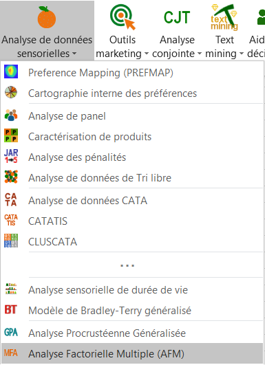 Pour afficher la boîte de dialogue de l'Analyse Factorielle Multiple, lancez XLSTAT, puis choisissez les commandes Fonctions avancées / Analyse de données multiblocs / Analyse Factorielle Multiple (AFM). La fonction est également disponible dans le menu Analyse de données sensorielles.