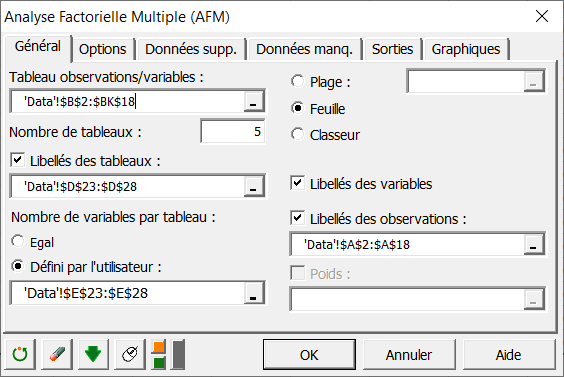Sélectionnez alors les données correspondant à l'ensemble des variables à analyser. Comme nous l'avons vu en haut, les variables sont regroupées en 5 tableaux distincts. On doit alors indiquer à XLSTAT que le nombre de tableaux est 5.