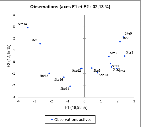 En observant le graphique des observations (sites) ci-dessus on remarque un groupe d’observations sur la droite ayant des valeurs positives sur l’axe 1.