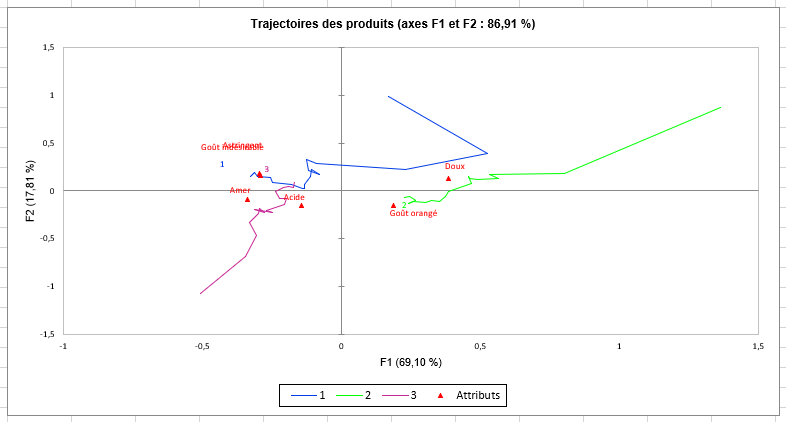 On voit par exemple sur ce graphique que le produit 2 à droite sur le graphique est associé aux attributs goût orangé et doux. On peut également voir que le produit 1 a tendance à être caractérisé par les attributs doux et goût orangé au début mais ensuite il est plutôt caractérisé par un goût indésirable. Ces conclusions peuvent se vérifier sur les graphiques des courbes par produits présentés plus haut.