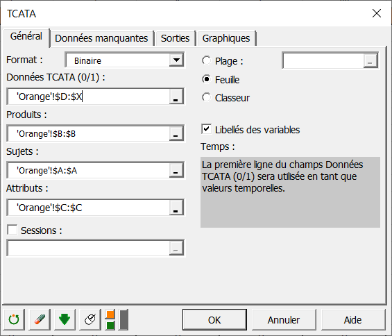 Dans l’onglet Général, sélectionner le format Binaire car les données TCATA (colonnes D à X) sont au format binaire, c’est-à-dire que pour chaque ligne (combinaison produit/sujet/attribut) un vecteur binaire de taille 21 (de 0 à 20 secondes) caractérise la combinaison avec 1 si l’attribut est sélectionné au temps t et 0 sinon. Comme l’option Libellés des variables est sélectionnée la première ligne de la sélection Données TCATA (0/1) est considérée comme le vecteur de temps. Sélectionnez ensuite les colonnes A, B et C respectivement dans les champs Sujets, Produits et Attributs.