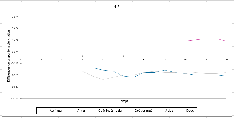 Ce graphique montre par exemple que la proportion de citation de l’attribut doux entre les temps 7 et 20 est significativement inferieure sur le produit 1 comparé au produit 2. Par contre la proportion de citation de l’attribut goût indésirable entre les temps 16 et 20 est significativement supérieure sur le produit 1 comparé au produit 2.