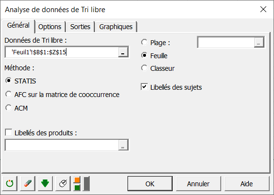La Méthode indique votre choix sur la stratégie que vous préférez adopter. STATIS utilisera la méthode indiquée à la suite d’un prétraitement adapté. AFC sur la matrice de cooccurrence réalisera une Analyse Factorielle des Correspondances sur la matrice de cooccurrence des produits. Enfin, ACM utilisera une Analyse des Correspondances Multiples sur les données brutes saisies.