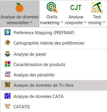 Une fois XLSTAT lancé, sélectionnez le menu XLSTAT / Fonctions avancées / Analyse de données sensorielles/ Analyse de données de Tri Libre.