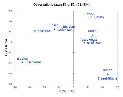 Un des résultats les plus important de l’analyse de données de Tri Libre est la représentation graphique des produits. Sur le graphique suivant nous pouvons voir d’une part que nous avons 31.18% d’inertie expliquée par les deux premiers axes, ce qui est très commun dans le cas de variables qualitatives. Il est conseillé cependant de regarder les axes 3 et 4, mais dans notre cas aucune information supplémentaire ne nous est donnée. Le graphique montre que les sujets ont globalement trouvé 5 groupes de chocolats. De plus, il est clair que le groupe constitué de Divine et Green&Blacks ainsi que celui contenant JSValue et TescoValue sont complètement éloignés des autres.