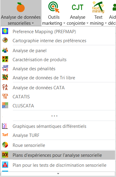 Une fois XLSTAT lancé, cliquez sur l’icône Analyse de données sensorielles et choisissez la fonction Plans d’expérience pour l’analyse sensorielle.