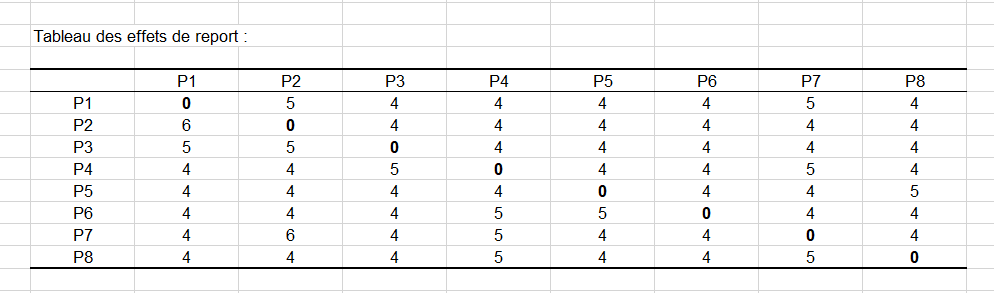 Le tableau des effets de report indique combien de fois chaque produit a été évalué juste après un autre.