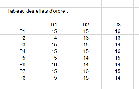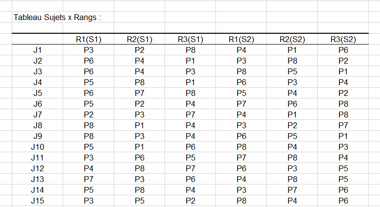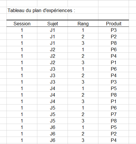 Le tableau du plan d'expériences pourra être analysé avec une ANOVA, une fois les évaluations recueillies. On a donc 4 colonnes, une pour la session, une pour le sujet, une pour le rang et une pour le produit. Ce tableau aura donc 2*60*3 lignes (360 lignes).