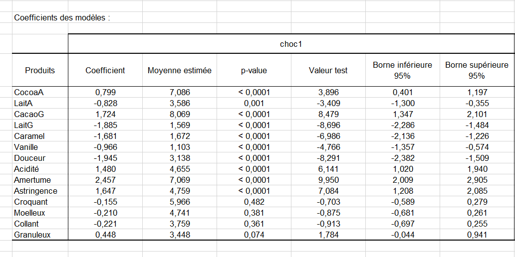 Le tableau suivant, dont une vue partielle est donnée ci-dessous (uniquement pour le produit choc1), rassemble l’ensemble des sorties importantes des analyses de la variance effectuées. Les coefficients des modèles, les moyennes estimées, des valeurs tests et des intervalles de confiance sont rassemblés.