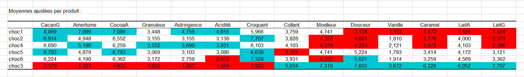 Finalement, le dernier tableau permet de faire ressortir les moyennes lorsque l'on croise les différents produits et les caractéristiques. On voit donc en bleu les moyennes qui sont significativement plus grandes que la moyenne globale et en rouge celles qui sont significativement plus petites que la moyenne globale. Pour choc1, on voit que ce produit a un goût fortement chocolaté, est amer et a un aspect très chocolaté. A l’inverse, le produit choc3 est une boisson chocolatée très sucrée, au lait.