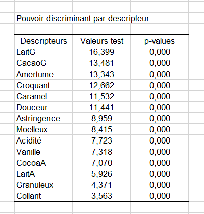 Le tableau suivant rassemble les descripteurs ordonnés du plus discriminant au moins discriminant sur les boissons chocolatées. On voit que le goût de lait (LaitG) est le descripteur le plus discriminant. Les p-values associées montrent toutes un effet significatif du descripteur.
