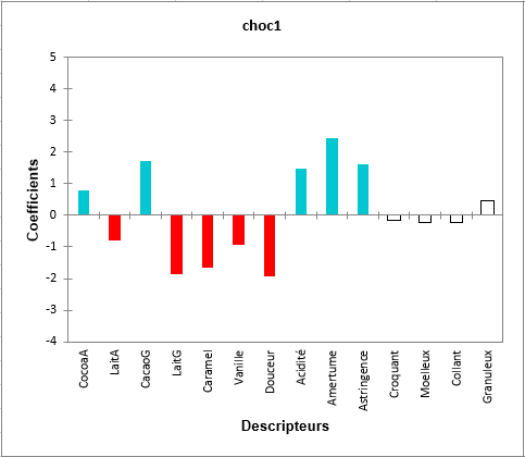 Le graphique qui suit permet de voir en un coup d’œil ce qui définit le produit (ici choc1). En bleu, on voit les caractéristiques dont le coefficient est significativement positif et en rouge celles dont le coefficient est significativement négatif. La boisson choc1 a donc un aspect plutôt cacao (cacaoA), et un goût de cacao marqué (CacaoG), elle est amère et acide. Par contre, elle n’a pas de goût de lait ou de vanille et n’est pas douce.