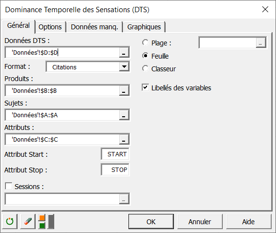Dans l’onglet Général, sélectionner le format Citation. Sélectionner les colonnes de moments/temps, de produits, de sujets et d’attributs respectivement dans les champs Données DTS, Produits, Sujets et Attributs. Saisir le nom des attributs de début et de fin dans les champs correspondant comme ils apparaissent dans le jeu de données (START et STOP).