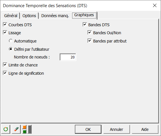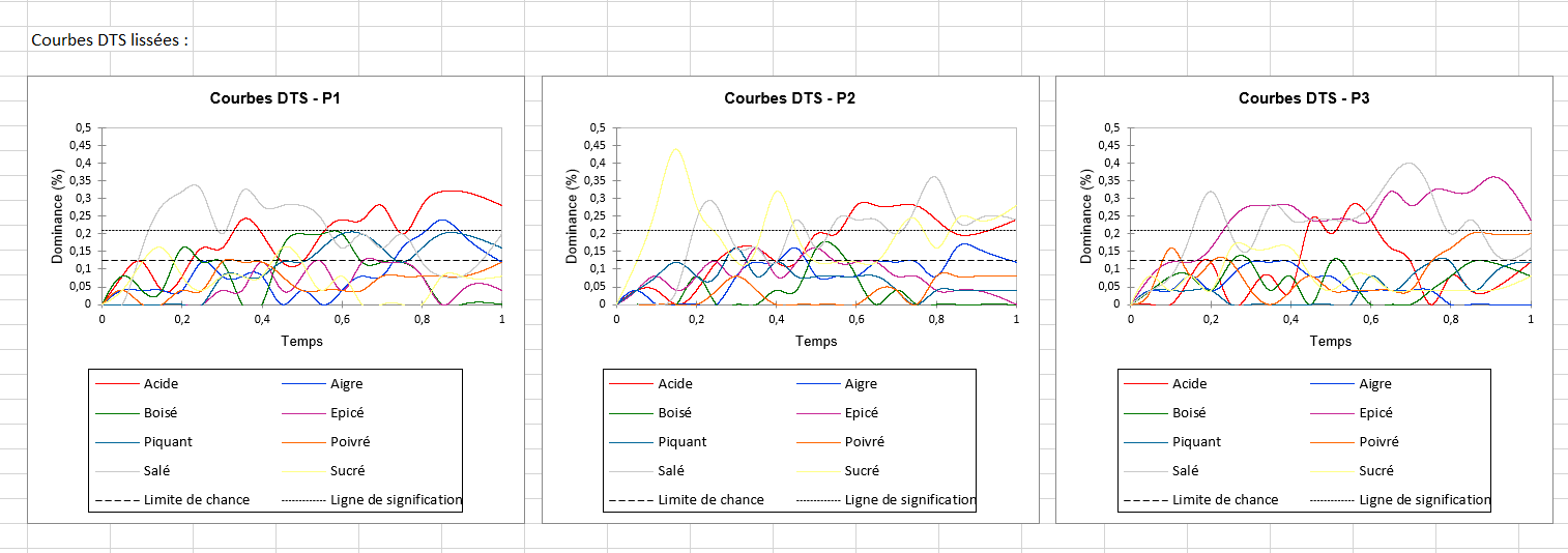 Le tableau ci-dessus permet de tracer l’ensemble des courbes DTS lissées (une par attribut) pour chaque produit présent lors de l’analyse. On considère que la dominance d’un attribut est significative quand sa courbe DTS lissée respective est supérieure à la ligne de significativité.