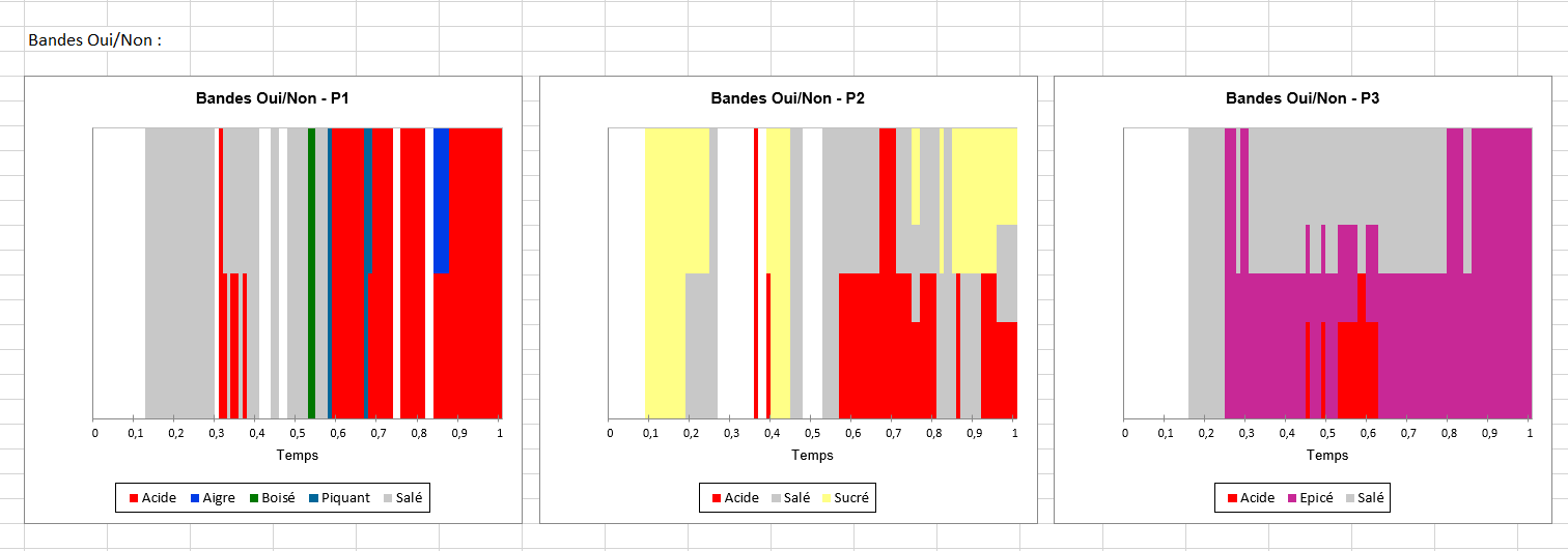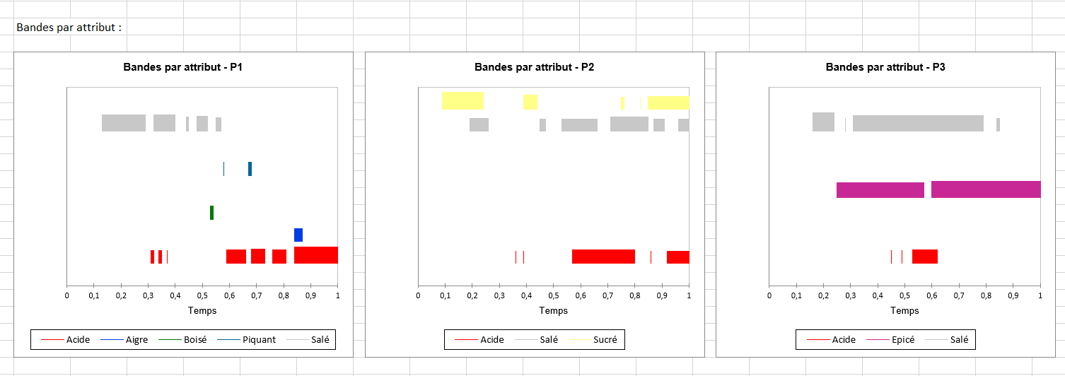 Pour le produit P1, on constate que la première moitié de l’expérience est dominée par l’attribut salé, avant que ce dernier ne laisse place à l’attribut acide sur la seconde partie de l’expérience.