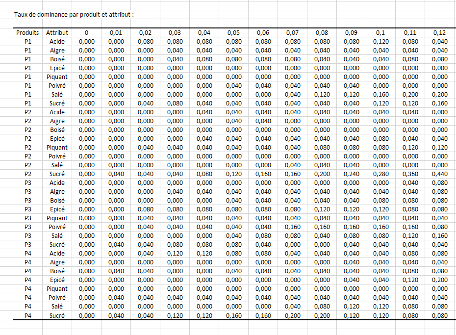 Le premier tableau contient, pour chaque moment/temps, le taux de dominance par produit et attribut en fonction du temps. Comme nous avons sélectionné une standardisation, les moments/temps sont répartis sur 100 colonnes.