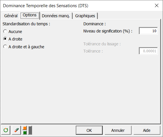 Dans l’onglet Options, choisissez le type de standardisation du temps que vous souhaitez appliquer. Dans notre cas, il s’agit d’une standardisation à droite : cela permet de ramener toutes les fins de test au même moment/temps. Pour une standardisation à gauche et à droite, les moments/temps sans dominant sont retirés. Choisir le niveau de signification (en pourcentage) au-dessus de la limite de chance. Cette dernière est égale à l’inverse du nombre d’attributs.