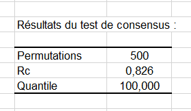 Un test de consensus est alors réalisé pour vérifier si la configuration consensus (calculée comme la configuration moyenne après les différentes transformations) correspond à un véritable consensus. Ce test de permutation permet de déterminer si la valeur observée de Rc (Rc correspond à la proportion de la variance totale expliquée par la configuration consensus) est sensiblement plus élevée que 95% des résultats obtenus après permutation.
