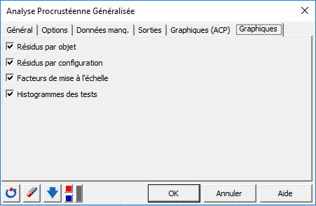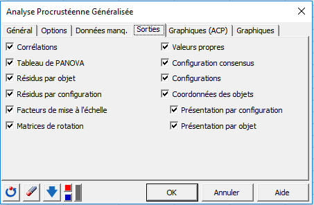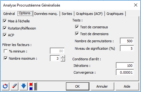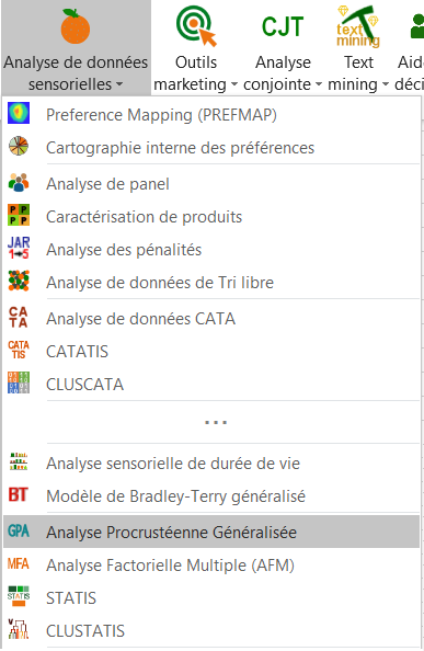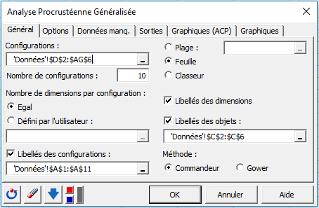 Pour activer la boîte de dialogue de l'Analyse Procustéenne Généralisée, choisissez la commande Analyse de données sensorielles /Analyse Procustéenne Généralisée ou Analyse de données multitableaux / Analyse Procustéenne Généralisée.