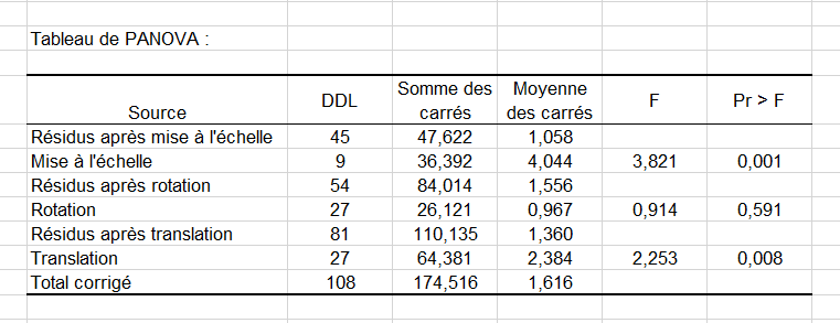 Le premier tableau correspond au tableau de PANOVA donnant l'efficacité relative des différentes transformations. On voit ici la mise à l'échelle a eu un impact prépondérant sur la réduction de la variabilité des configurations.