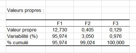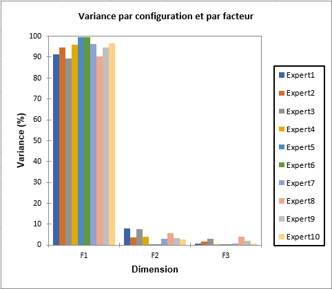 Les résultats qui suivent concernent l'ACP qui est réalisée après l'Analyse Procustéenne Généralisée. Il s'agit ici d'une ACP non normée. Alors que l'Analyse Procustéenne Généralisée inclut déjà des rotations optimales appliquées à chacune des configurations pour obtenir un consensus, l'ACP permet d'appliquer une transformation à la configuration consensuelle de manière à obtenir une représentation optimale sur les premiers axes. La transformation de l'APC est ensuite appliquée à chacune des configurations correspondant à chaque expert. Les valeurs propres indiquent la proportion de la variabilité totale représentée sur chacun des axes factoriels. On peut voir que 99% de la variabilité est représentée sur les deux premiers axes. Lorsque la variabilité est analysée au niveau de chaque expert, on peut voir que la situation est analogue pour l'ensemble des experts.