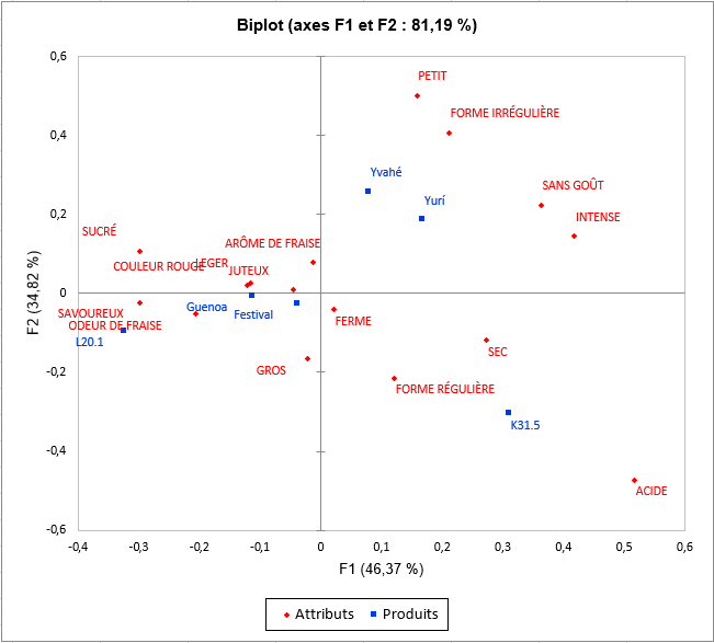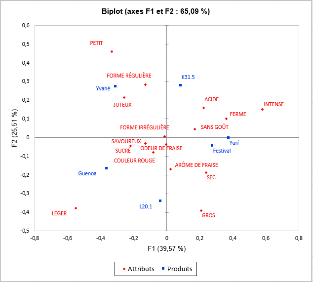 Viens ensuite l’analyse de chacune des classes construites. La représentation des produits et des attributs dans chaque classe met en lumière des différences de perception entre les classes de sujets. En effet, les fraises Yvahé et Yurí sont placées ensemble dans la classe 1 et sont considérées comme différentes dans la classe 2. Nous pouvons également noter que la fraise Yvahé est considérée plutôt de forme irrégulière dans la classe 1 et de forme régulière dans la classe 2.