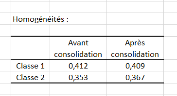 Enfin, l’indice d’homogénéité de chaque classe permettent d’évaluer la qualité de la classification. Plus ces indices sont proches de 1, plus les classes sont homogènes. Ici, nous voyons que la classe 1 est plus homogène que la classe 2. Ces homogénéités pourraient être améliorées avec l’ajout d’une classe « K+1 ».