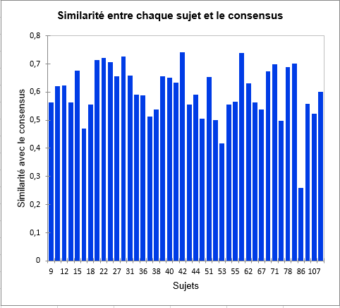 Le graphique suivant donne des indications sur la proximité des sujets et du tableau consensus de la classe dans laquelle ils sont placés. Ces proximités sont représentées par le coefficients de similarité d’Ochiai, qui est un indice de similarité entre 0 et 1. Dans la classe 2, nous pouvons observer que le sujet 86 est bien plus éloigné du consensus que les autres, ce qui signifie qu’il ne se conforme pas bien à la classe. Sa perception est différente des deux classes (puisqu’il a été placé dans la classe qui lui correspond le mieux par l’algorithme). Ce genre de problématique peuvent être résolues par l’ajout de la classe « K+1 » dans l’onglet Options, qui est une classe supplémentaire prévue pour mettre de côté les sujets atypiques. Attention, dans une épreuve CATA, il est très fréquent de mettre de côté une grande partie des sujets avec la classe « K+1 ». Ceci est dû au fait que les sujets donnent des résultats souvent bien différents.