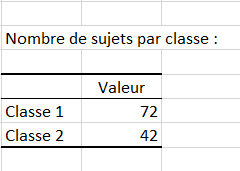 Il s’en suit trois tableaux, donnant les résultats par des groupes par sujet, par classe ainsi que le nombre de sujets dans chaque classe. Nous pouvons ici voir que la classe 1 contient bien plus de sujets que la classe 2.