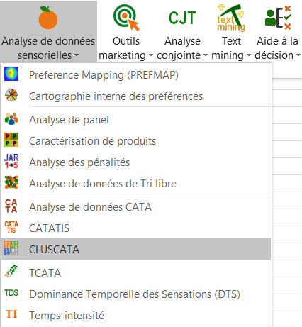 Une fois XLSTAT lancé, sélectionnez le menu XLSTAT / Fonctions avancées / Analyse de données sensorielles/ CLUSCATA.
