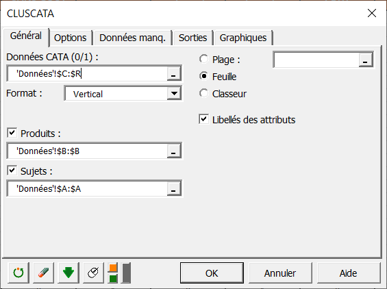 Nous utiliserons la fonction CLUSCATA de XLSTAT pour faire cette analyse. Cet outil nous permettra de réaliser les trois objectifs définis ci-dessus.