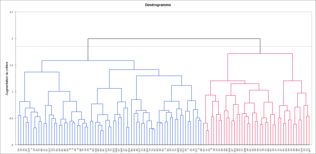 Le graphique ci-dessous est le dendrogramme. Il représente de manière claire la façon dont l'algorithme procède pour regrouper les sujets puis les groupes de sujets. L'algorithme a progressivement regroupé tous les sujets. La ligne en pointillé représente la troncature et permet de visualiser que deux classes ont été identifiées.