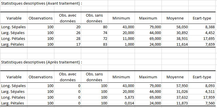 Ensuite les statistiques descriptives avant et après imputation sont affichées.