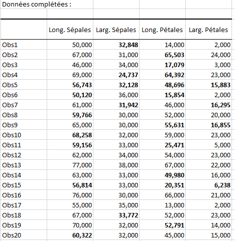 Puis les données complétées sont affichées et les données initialement manquantes sont en gras.