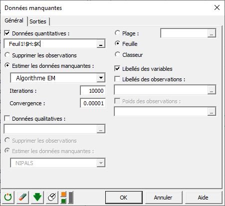 Dans le champ Données quantitatives sélectionnez les colonnes H à K qui correspondent au jeu de données avec les valeurs manquantes introduites aléatoirement. Choisissez ensuite d’estimer les données manquantes à l’aide de l’algorithme EM.