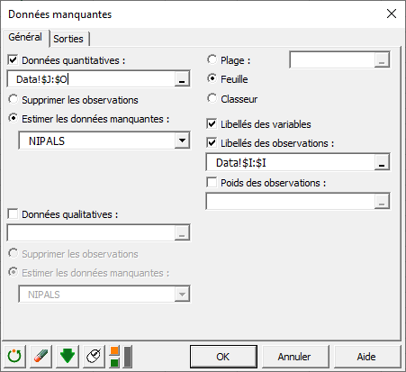 Une fois que vous avez cliqué sur le bouton, la boîte de dialogue apparaît. Sélectionnez les données à compléter (le tableau avec données manquantes). Le type de données est quantitatif et la méthode d'estimation est la méthode NIPALS.