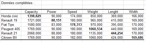 On peut voir les données complétées en gras. Dans notre cas, nous pouvons comparer ces valeurs aux vraies valeurs disponible dans le premier tableau.
